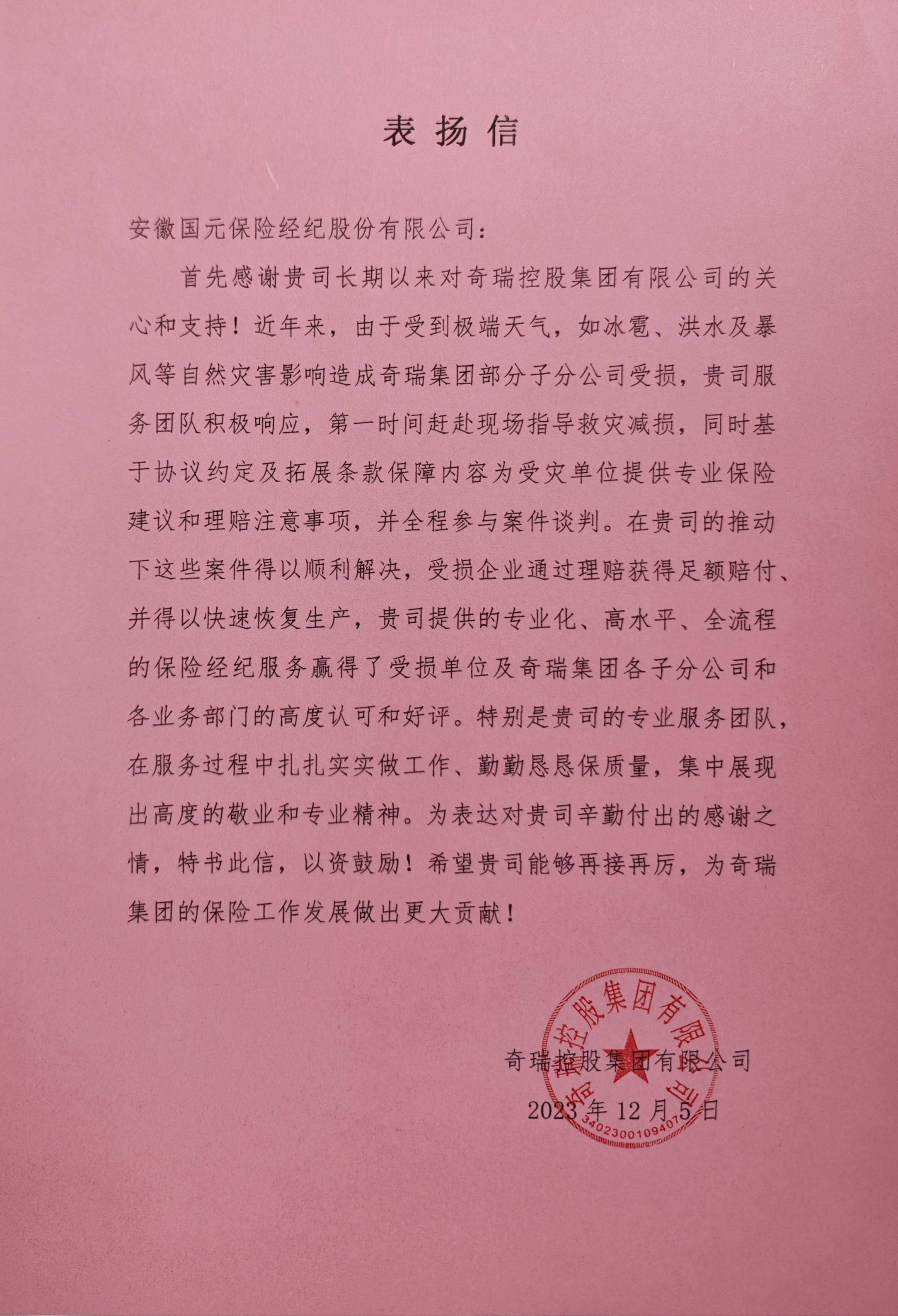 奇瑞集團在表揚信中特別提到,國元保險經紀在服務過程中扎實工作,勤勉盡責,展現出高度的敬業和專業精神,贏得了受損單位、奇瑞集團各子分公司及各業務部門的高度認可和好評。